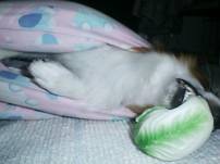 | お昼寝布団をたたんでおいたら自分でもぐって遊んでました。とってもお茶目なたんぽぽです。 |