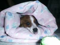 | お昼寝布団をたたんでおいたら自分でもぐって遊んでました。とってもお茶目なたんぽぽです。 |