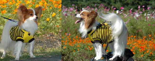| マロンちゃんちの名カメラマン(パパ?)に撮ってもらった”コスモスとぼく”・・似合うでしょう? “〆(^∇゜*)♪ |