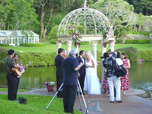 午後は自由時間。 プールや、パターゴルフ、読書、昼寝と思い思いに過ごす。 夕方、庭の池のそばで、結婚式をやっている。 写真を撮ってみた。