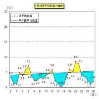 ※グラフの青い部分は平年値より気温が低いことを、黄色い部分は平年値より気温が高いことを表しています。