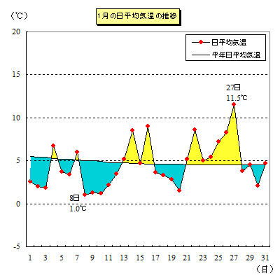 ※グラフの青い部分は平年値より気温が低いことを、黄色い部分は平年値より気温が高いことを表しています。