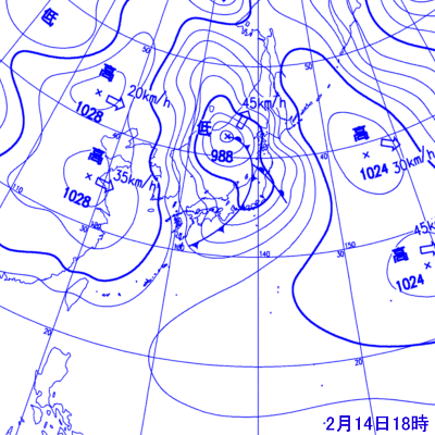 ●参考:2月14日の地上天気図と高層(850hPa面)天気図
