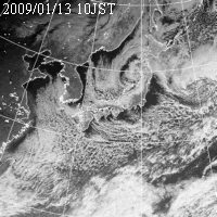 気象衛星の雲画像を見ると、1月16日を境に雲の様子が大きく変わっています。15日までは、日本海から黄海、東シナ海にかけて筋状の雲におおわれており、上層の寒気が強く冬型の気圧配置となっていることを示しています。16日になると、日本海と黄海に広がっていた筋状雲は少なくなり、東シナ海ではほとんど消えています。18日になると日本海の筋状雲もなくなり、かわりに低気圧に伴う木の葉状の雲が西から進んできました。