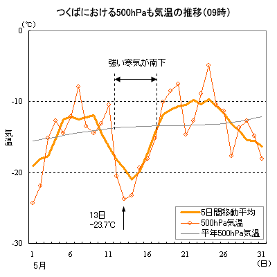 一方、気温の推移を見ると、4月に引き続き偏西風の南北への蛇行が大きく、寒気の南下する時があって気温の変動が大きくなりました。旬別の平均気温を見ると、南から暖かい空気の入った上旬は16.7℃と平年より1.7℃高くなりました。しかし、寒冷渦に伴い寒気の入った中旬は14.9℃と平年より1.1℃低く、同じく下旬も15.0℃と平年より2.2℃低くなりました。この結果、月平均気温は15.5℃と平年より0.6℃低くなりました。