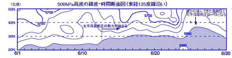 ●500hPa高度の緯度・時間断面図(東経135度線沿い、6月1日〜30日)