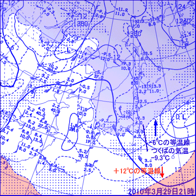 ●参考:3月29日21時の地上天気図、500hPaと850hPa面高層天気図及び10分毎の気温の推移