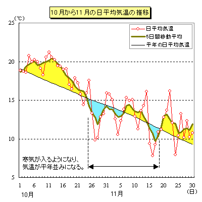 10月は太平洋高気圧が日本の南で東西に広がり、暖かい空気が入りやすくなりました。また、日本付近は北海道の東に中心を持つ高偏差におおわれ、寒気の影響を受けにくい気圧配置でした。11月になると、偏西風が南北に蛇行して東シナ海を中心に気圧の谷場となり、日本付近も負偏差におおわれて寒気が入りやすくなりました。