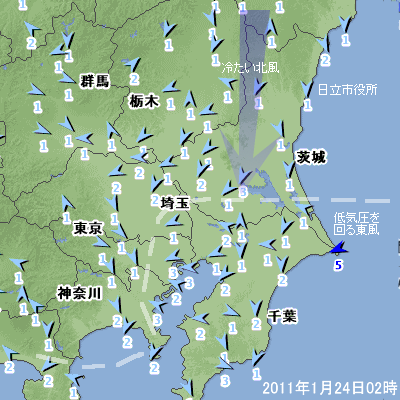 ●参考:1月24日00時の気象衛星赤外画像と02時のアメダスによる風の分布