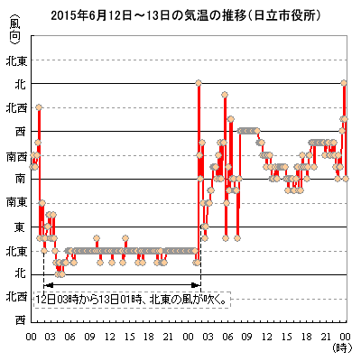 ●2015年6月12日から13日の風向の推移(日立市役所と十王交流センター)