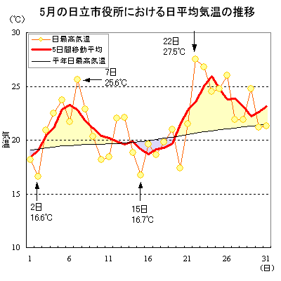 今年の5月は、中旬に一時的に寒気が入り気温が低い日がありました。しかし、それ以外の日は南からの暖気におおわれ気温が高くなりました。特に、下旬は大陸から北日本へ流れ込んだ暖気が南下してきて、日立市でも気温の高い日が続きました。下旬の平均気温は19.3℃と平年より2.2℃高く、5月下旬の気温としては観測開始以来3番目に高い気温となりました。