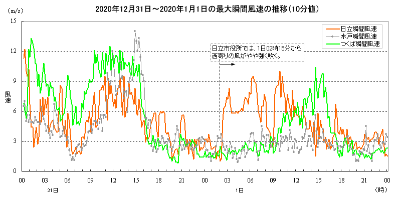 日立市役所における31日の気温の推移をみると、北西の季節風が弱まり始めた15時頃から気温が下がり始めました。夜に入っても気温は下がり続け、19時過ぎには気温が0℃を下回り、22時36分には日最低気温-2.2℃を記録しました。これは、日立市役所における今季の最低気温です。最低気温を記録した後、北西の風がやや強まり気温は横ばいで推移しました。なお、翌日(1日)の1時から2時にかけて風が弱まり、1日01時50分に最低気温-2.7℃まで下がりました。しかし、2時過ぎには西の風が強まって気温は3℃近く上がり、1日の朝にかけて気温は0℃以上で推移しました。